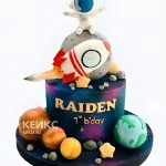 Этот торт переносит в загадочный мир космоса. Глубокий синий фон украшен мерцающими звездами и планетами, создавая эффект бескрайней вселенной. Объемные элементы – ракеты и летающие тарелки – словно парят в пространстве. Серебристые блики и переливы добавляют торту динамики и загадочности. Каждая деталь продумана, чтобы передать атмосферу космического путешествия.