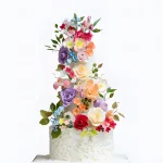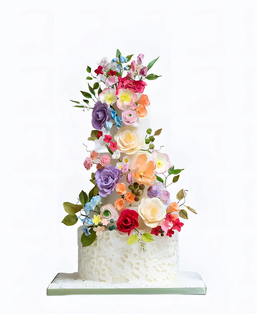 Высокий трендовый торт с яркими цветами на свадьбу