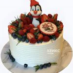Очаровательный круглый торт в нежных пастельных тонах. На белоснежной кремовой поверхности расположился милый пингвин из мастики, окруженный сочными ягодами. Фиолетовые и розовые акценты создают сказочную атмосферу зимней сказки. Композиция напоминает заснеженную поляну, где резвится этот симпатичный арктический житель.