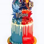 Яркий праздничный торт с динамичной композицией по мотивам аниме. Насыщенная цветовая палитра с преобладанием красного, синего и желтого создает энергичное настроение. Фотопечать с любимыми персонажами обрамлена объемными кремовыми розами и декоративными элементами. Идеально передает дух вселенной My Hero Academia через яркие визуальные акценты.