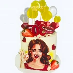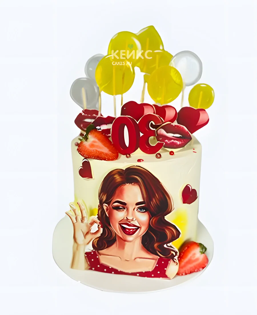 Яркий торт женщине на 30 лет с фотопечатью и клубникой