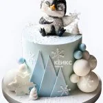 Нежный голубой торт словно кусочек зимней сказки. Гладкая кремовая поверхность напоминает снежный покров, а милый пингвин из крема смотрит с торта с любопытством. Контраст белого и голубого создает ощущение свежести и чистоты, будто морозное утро. Простые, но выразительные детали делают этот десерт трогательным и атмосферным – он будто сошел с открытки.