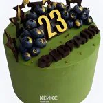 Торт выполнен в насыщенной зелёной палитре, напоминающей военную форму. Велюровая текстура создаёт эффект бархатистой поверхности, а яркие красные ягоды контрастно выделяются на основном фоне. Композиция дополнена стилизованными элементами в духе праздника — строгими линиями и лаконичным расположением декора. Сочетание глубокого зелёного и сочного красного рождает ощущение торжественной сдержанности и одновременно праздничного настроения.