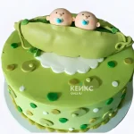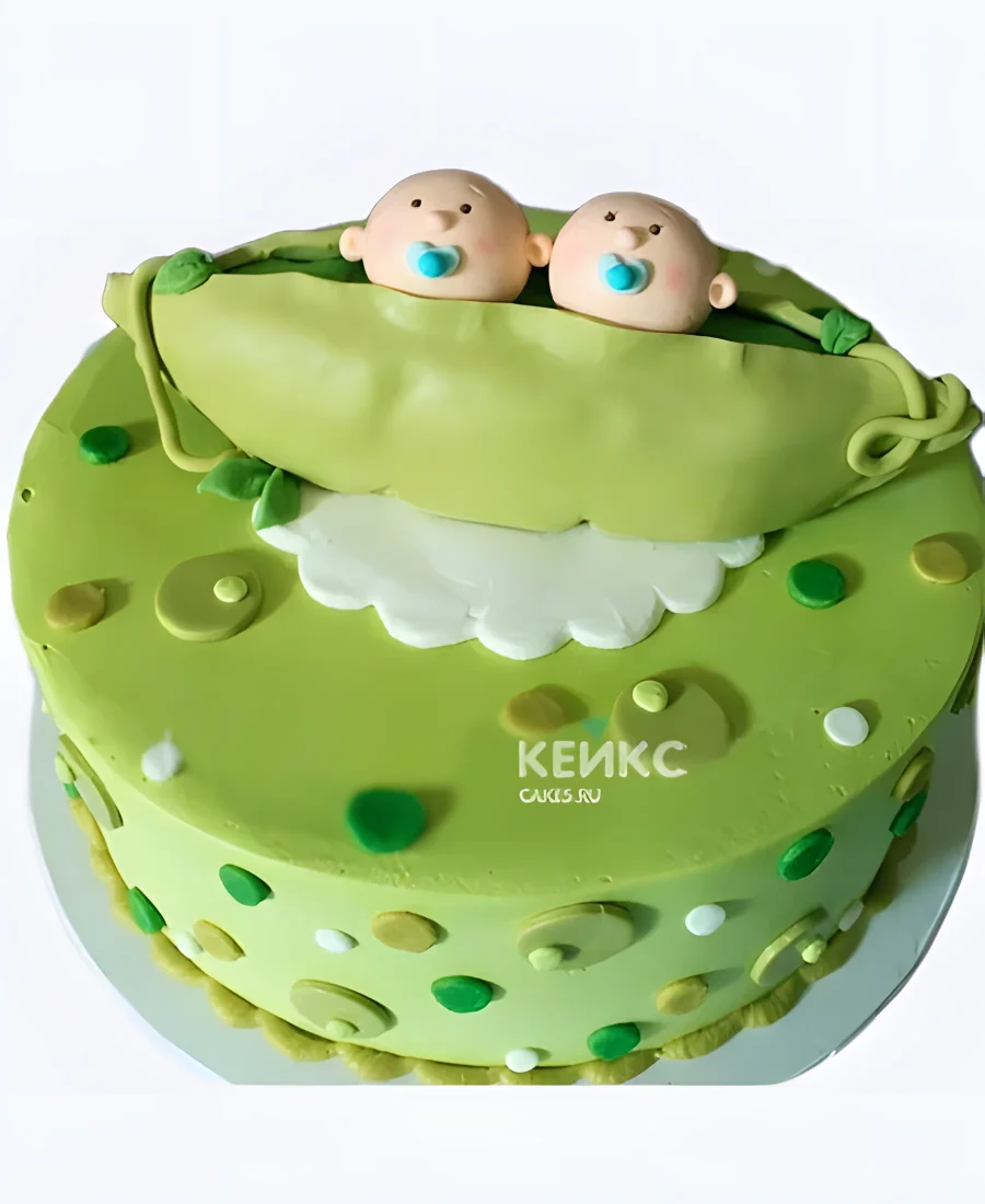 Зеленый тортик с горошком и малышами для мальчиков двойняшек