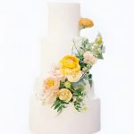 Этот свадебный торт словно сошел со страниц сказки – его нежные кремовые ярусы украшены изящными розами, будто только что сорванными с цветущей ветки. Пастельные оттенки желтого и бежевого создают ощущение тепла и уюта, а натуралистичные цветы придают торту воздушность и романтичность. Каждый ярус будто окутан легкой дымкой, а композиция из роз перетекает сверху вниз, напоминая весенний сад. Торт выглядит одновременно роскошно и очень нежно, словно воплощение мечты о совершенстве.