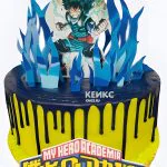 Яркий желтый торт с динамичным дизайном в стиле аниме «Моя геройская академия». Фотопечать с любимыми персонажами и фирменными элементами сериала создает эффект ожившей вселенной. Аппликации из мастики добавляют объем и игривость. Солнечный оттенок торта заряжает энергией и праздничным настроением, словно отсылая к культовым сценам из аниме.